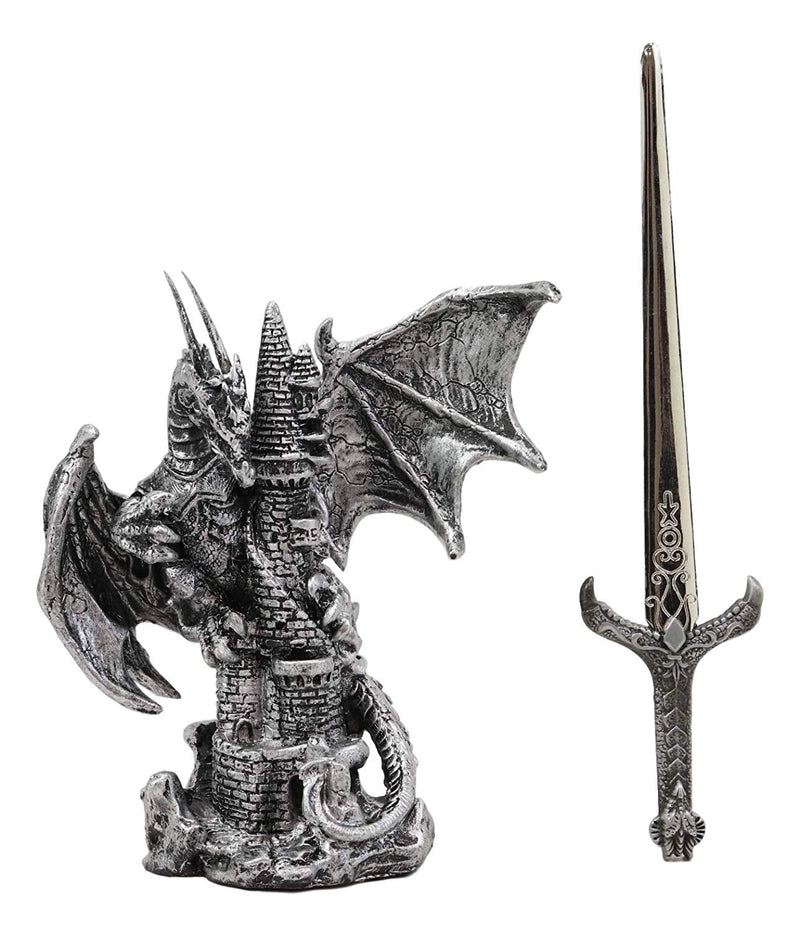 Ebros Gift Legendary Silver Dragon Protecting Castle Tower Letter Open